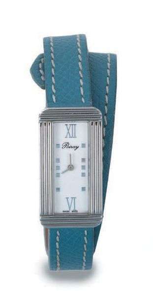Montre de dame en acier, cadran rectangulaire fond blanc.