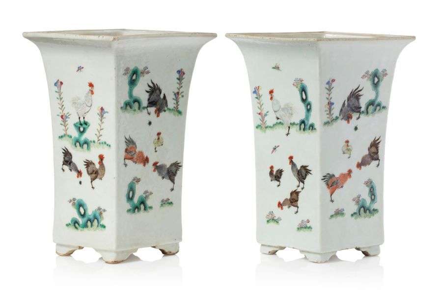 Paire de vases quadrangulaires à larges pavillons en porcelaine et émaux de la famille rose, à décor de coqs.