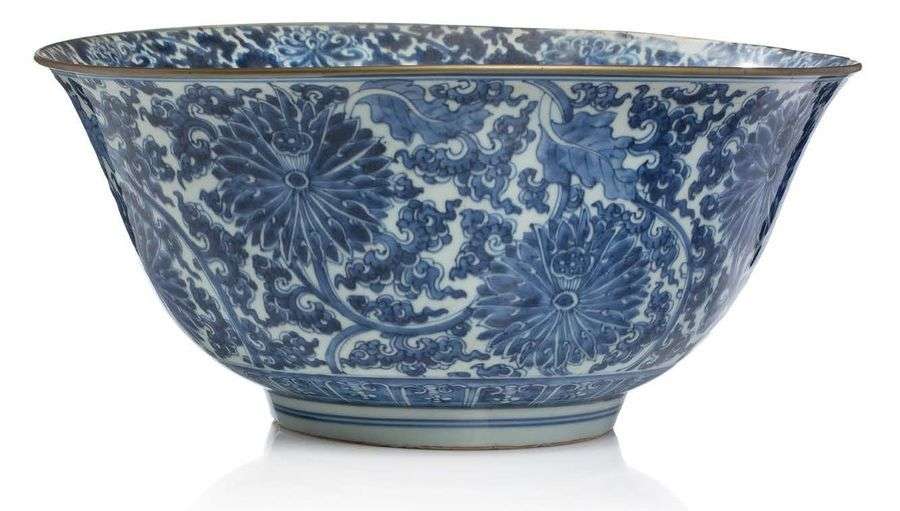 Grande coupe en porcelaine blanche, à décor émaillé bleu sous couverte, le fond orné d'une fleur de lotus stylisé parmi des nuages, l'extérieur de même décor. Une frise de feuilles de bananier stylisées sur le pied et le bord cerclé de métal.