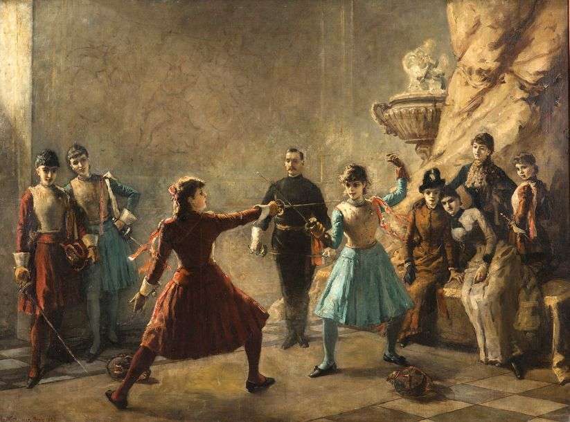 The fencing master in dark clothing, the only male figure, dominates the scene from the centre of the composition, while the two duellists face each other in gracefully adopted positions. On either side, groups of spectators - some of them other pupils - make comments on what is happening.the viewers, who feel they are part of a group watching a fencing match. What is surprising and unusual in 1885 is that the duel involves two girls. It is hard not to think of Hauteclaire Stassin, the romantic heroine of Jules Barbey d'Aurevilly's 1874 novel Le Bonheur est dans le Crime.
