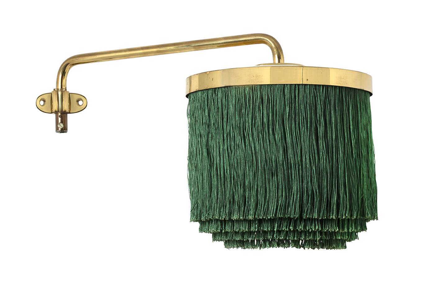 Brass frame, white ABS shade featuring green silk fringes.