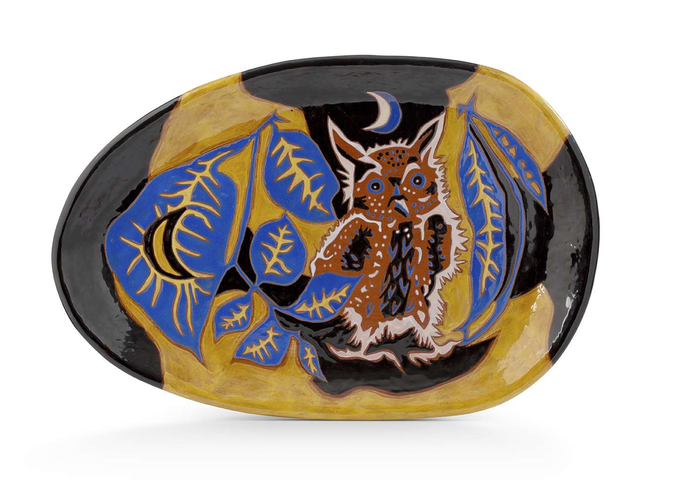 Glazed ceramic, with a polychrome decoration of an owl amongst branches on a yellow and black background.