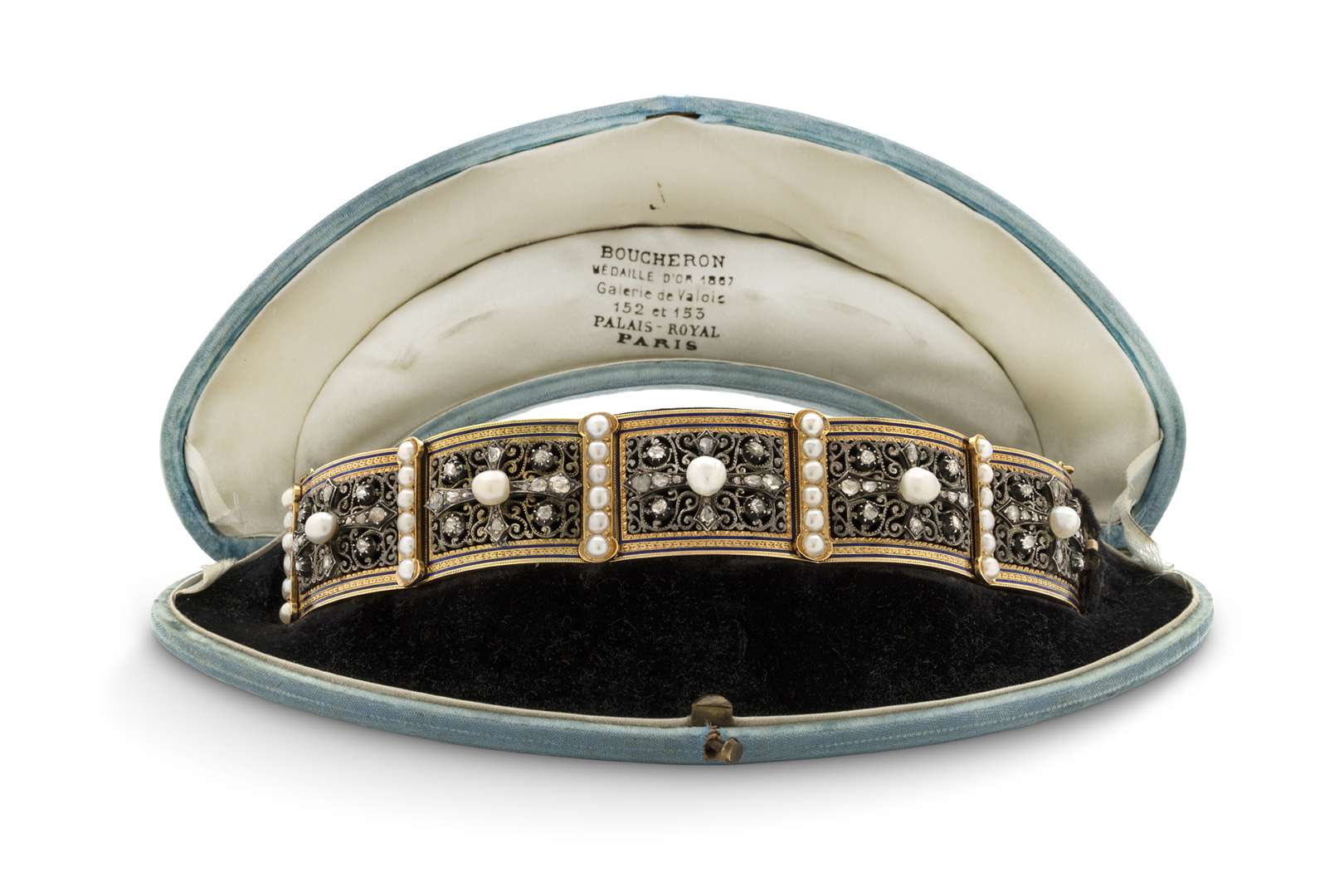 An enamel, diamond, pearl, gold and silver bracelet, from Boucheron, circa 1870, certificate