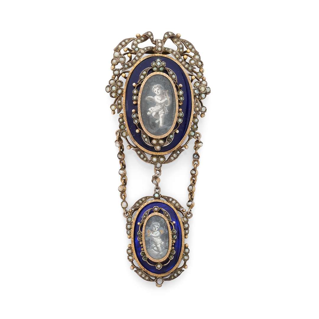 An enamel, pearl, gold and silver brooch-pendant