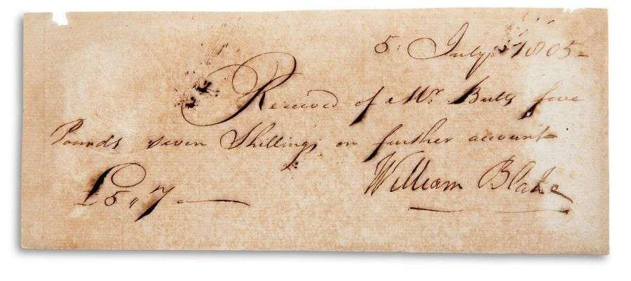 Rarissime reçu à un collectionneur et mécène. Reçu de Mr Butts 5 livres et sept shillings d’acompte. Thomas BUTTS (1757-1845) a été le mécène principal de William Blake | il lui assura pendant de longues années des versements d’argent qui lui donnèrent de quoi vivre, en échange d’œuvres. L’année 1805 fut une année particulièrement dure pour Blake. Plusieurs de ses clients se détournèrent de ses œuvres aux visions ténébreuses et sa situation financière s’assombrit. Seul Thomas Butts n’a jamais semblé douter de son génie, et lui octroya un salaire régulier qui lui permit d’avoir des revenus stables, bien que modestes, pendant les cinq années qui suivirent.
