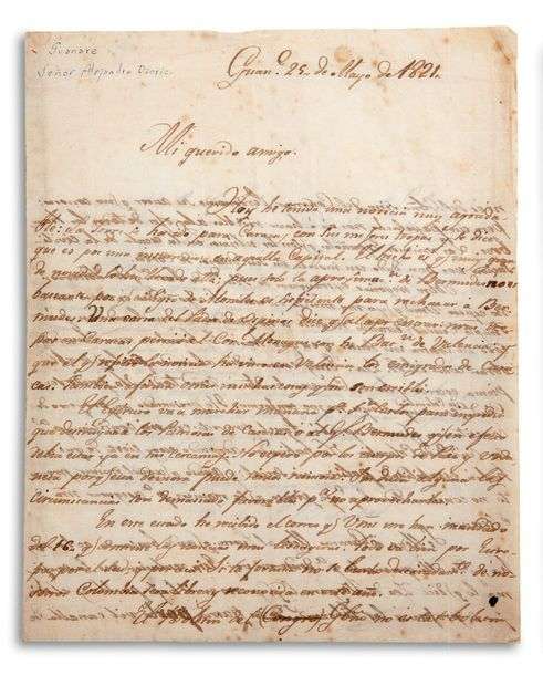 importante lettre politique et militaire, un mois avant la bataille décisive de Carabobo, sur la libération prochaine du Venezuela et de la Colombie, et ses interrogations sur son propre rôle politique. Bolivar fait ici état des préparatifs qui se déroulent en vue de l’importante bataille de Carabobo, qui eut lieu un mois plus tard, le 24 juin 1821. C’est avec Bolivar à leur tête que les patriotes d’Amérique du Sud défirent les royalistes espagnols dans les plaines proches de Caracas, libérant ainsi pratiquement le Venezuela (intégré à la Grande Colombie) du joug espagnol. Le général Camilo LA TORRE commandait les Espagnols. C’est avec l’aide des volontaires anglais et irlandais que le général José Antonio PÁEZ et ses Llaneros (hommes des plaines) mirent en déroute l’aile droite des Espagnols tandis que la cavalerie des patriotes les écrasait en plein centre. Bolivar cite en outre deux personnalités importantes : Francisco Antonio ZEA (1766-1822), qui fut le suppléant de Bolivar au Congrès du Venezuela, et premier vice-président de la Grande Colombie | et Francisco de Paula SANTANDER (1792-1840), qui succéda à Bolivar à la présidence de la Grande Colombie de 1819 à 1827. Il a reçu de très bonnes nouvelles : La Torre se dirige sur Caracas avec ses meilleures troupes, on dit que cela est dû à l’insurrection de la capitale. Le fait est qu’un événement très important l’a conduit là-bas parce que le rapprochement de BERMUDEZ ne suffit pas, l’armée de MORALES est en mesure de le repousser toute seule. Une lettre du Père d’Ospinos affirme que lorsque les troupes sont arrivées à Caracas, le Colonel Monagas est mort avec son bataillon de Valence, et que celui qui fait courir la nouvelle a vu à Valence ceux qui ont émigré de Caracas. Il fait également état