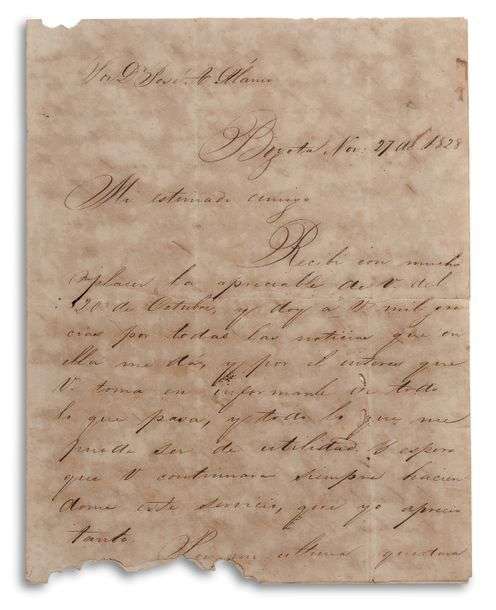 « El Libertador », héros et libérateur d’Amérique du Sud. L.S., Bogota 27 novembre 1828, à son ami José Angel ALAMO, à Caracas | 3 pages in-4 (papier bruni, bord inférieur un peu rongé, petits trous de vers, fentes réparées) | en espagnol | sous chemise entoilée demi-maroquin rouge, avec un portrait photographique inséré sur le contreplat supérieur.