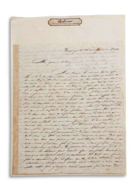 « El Libertador », héros et libérateur d’Amérique du Sud. L.S. « Bolivar », Guayaquil 21 août 1829, à Daniel Florence O’LEARY | 2 pages et demie in-4 (fente réparée au dernier feuillet, lettre montée sur onglet sur un feuillet in-fol. de papier vélin) | en espagnol.