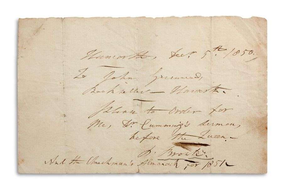 L.A.S. « P. Brontë », Haworth 5 décembre 1850, à John GREENWOOD, libraire à Haworth | 1 page oblong in-8 (quelques légères fentes).