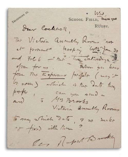 L.A.S. « Rupert Brooke », Rugby 16 décembre 1908, au directeur du Fitzwilliam Museum de Cambridge, Sydney COCKERELL | 1 page in-12 avec adresse au dos (Post Card) | en anglais.