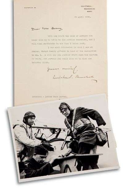 L.S. « Winston S. Churchill » avec compliment autographe, Chartwell, Westerham, Kent 28 avril 1939, au commandant d’escadron [et futur Commodore de l’air et parlementaire] Vere HARVEY | 1 page in-4 dactylographiée | en anglais.