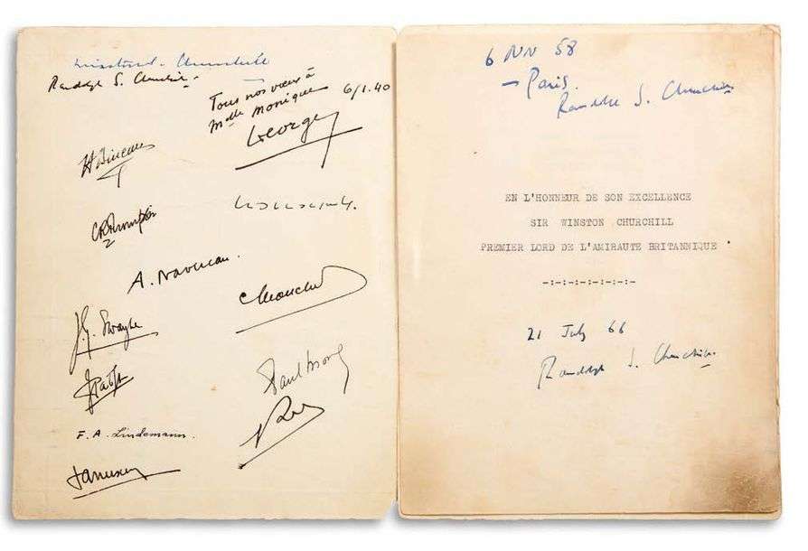 Menu illustré d’un dîner « en l’honneur de Son Excellence Sir Winston Churchill Premier Lord de l’Amirauté britannique », signé par celui-ci et par une douzaine de proches et de convives, avec envoi autographe signé et daté du général Alphonse Georges : « Tous nos vœux à Melle Monique ». Ont aussi signé : le physicien Frederick Alexander Lindemann, les généraux Henri Bineau et John George Swayne, le futur général André Navereau, J. Pabst, Paul Morel, etc. Randolph Churchill a resigné le menu deux autres fois, le 6 novembre 1958 et le 21 juillet 1966.