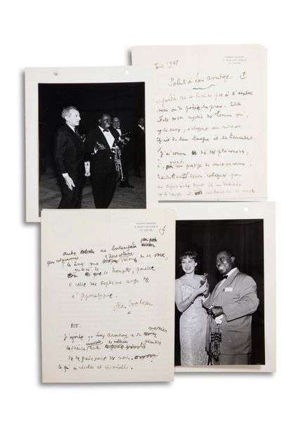 On joint la dactylographie d’un autre texte de Cocteau sur Armstrong, rédigé pour l’Académie du disque français en décembre 1955 (1 p. in-4). Plus 15 photographies du studio Erpé à Nice lors du Festival de Jazz de Nice (tirages d’époque en noir et blanc, 228 x 168 mm, montées sur des pages d’album) : Cocteau en compagnie de Louis Armstrong, lui remettant le Discobole | Armstrong dédicaçant un portrait, à la sortie de son hôtel, sur scène | le pianiste Samson François | les organisateurs du festival devant une affiche de Armstrong, etc. | et un petit doss