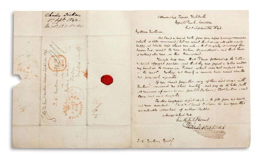 L.A.S. « Charles Dickens », Londres 1er septembre 1842, à Thomas C. GRATTAN, consul britannique à Boston | 1 page in-4, adresse avec cachet de cire rouge et marques postales | en anglais | sous chemise demi-maroquin vert.