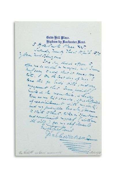 1 page in-8 à l’encre bleue, en-tête Gad’s Hill Place | en anglais (portrait gravé joint).