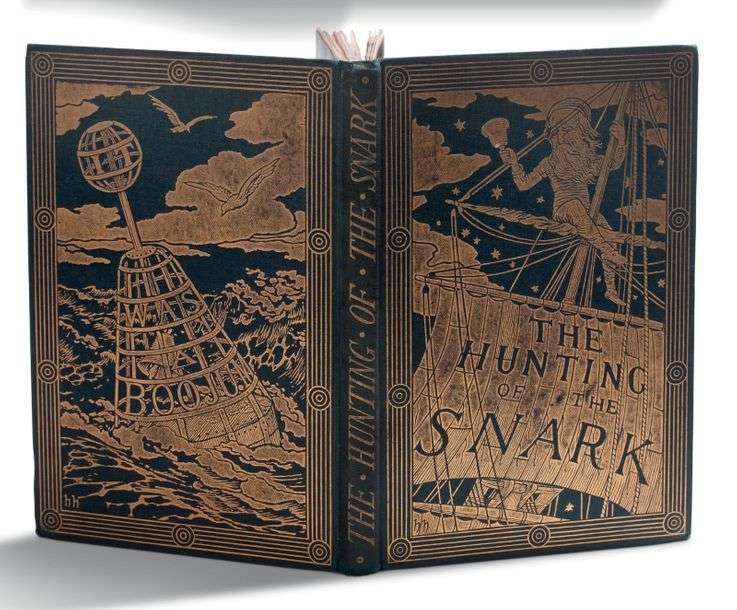 Reliure d’éditeur bleu nuit estampée à l’or présentant sur chaque plat une gravure de Henry Holiday entourée d’un sextuple filet doré ponctué de cercles : la gravure du plat supérieur représente l’homme à la cloche sur la mâture d’un navire dont une large voile est déployée | celle du plat inférieur, une balise sur une mer agitée, où sont inscrits les mots Was a Boojum (ces deux gravures ne figurent pas dans le corps de l’ouvrage) | titre au dos doré, toutes tranches dorées | gardes de papier noires | étiquette du relieur « Burn & Co » collée sur le 2e contreplat (boîte toilée bleu nuit).