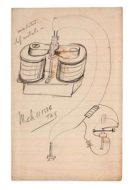 ENSEMBLE de 6 DESSINS avec NOTES autographes (3 signés « TAE »), mars 1886 | 6 feuillets in-8, et 1 feuillet in-12 recto-verso, au crayon sur papier ligné | le tout monté sous transparents dans une boîte-étui de maroquin vert contenant également un spécimen d’ampoule originale fabriquée par Edison.