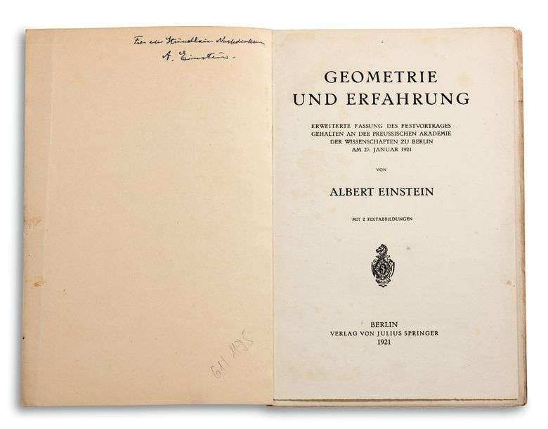 Geometrie und Erfahrung. Erweiterte Fassung des Festvortrages gehalten an der Preussischen Akademie der Wissenschaften zu Berlin am 27. Januar 1921 (Berlin, Julius Sringer, [1921]) | plaquette in-8 de 20 pages, brochée.