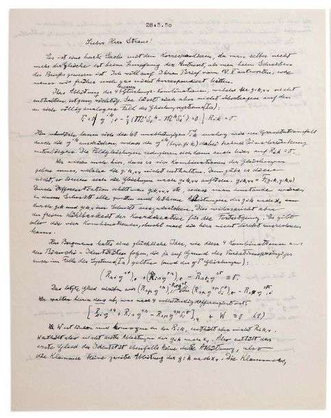Il évoque la difficulté de leur correspondance croisée, n’étant déjà plus le même quand on reçoit la réponse que quand on avait écrit la lettre. Il juge tout à fait correcte sa dérivation des 4 combinaisons d’équations linéaires, qu’il développe dans le détail. Il se réfère aux calculs de Bergmann, qui a eu une bonne idée de la manière dont ces 4 combinaisons découlent des identités de Bianchi… Etc.