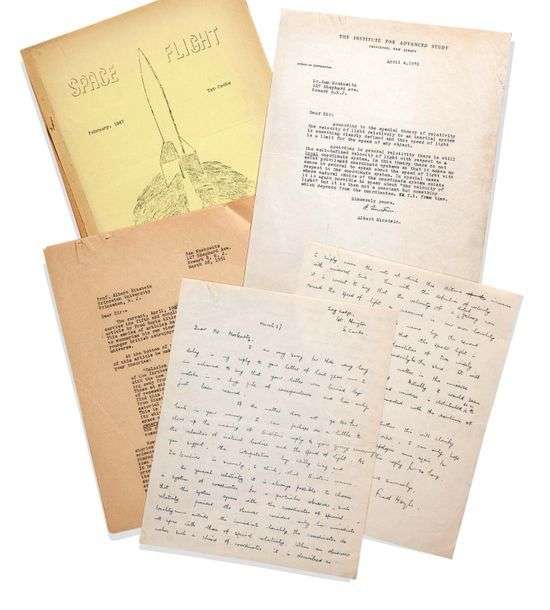 On joint : – le double carbone de la lettre dactylographiée de Sam MOSKOWITZ, 28 mars 1951 (2 p.), à Albert Einstein, l’interrogeant après la parution d’une étude de Fred Hoyle intitulée The Expanding Universe, formulant l’hypothèse que, dans le cadre de théorie de la relativité, un objet pourrait voyager à une vitesse supérieure à celle de la lumière | – une longue l.a.s. de l’astronome britannique Fred HOYLE (1915-2001) à Moskowitz, 27 mars [1952] (3 p. in-4), expliquant ses hypothèses, et commentant la lettre d’Einstein | – 2 brochures ronéotées de Gerry de LA REE : Space Flight When ?... « Featuring the results of the 1946 Beowulf Poll » (1 f-7 p. in-4), et Space Flight (février 1947, 1 f-9 p.).