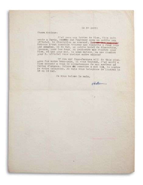 « J’ai recu une lettre de Else. Elle puit venir a Paris. Depuis que Faulkner sera un petite peu officiel, le discrétion se command. Est-que c’est possible trouver une domicile a deux pour une samaine […] un petite hotel de discrection, inconnu, pour les deux, ou peut-etre une chambre pour Else, et une pour moi, la meme maison, ou une chambre pour F. officiel dans quelque autre maison. If you and Jean-Jacques will do this kindness for votre beau-papa, il vous benisse. J’ai acrit a Else envoyer a vous le connaissance de son arrivee a Paris »…