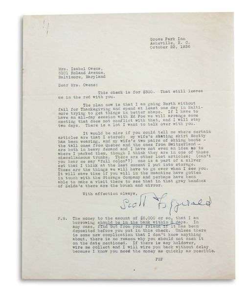 L.S. « Scott Fitzgerald », Asheville (North Carolina) 22 octobre 1936, à sa secrétaire Isabel OWENS, à Baltimore | 1 page in-4 dactylographiée | en anglais.