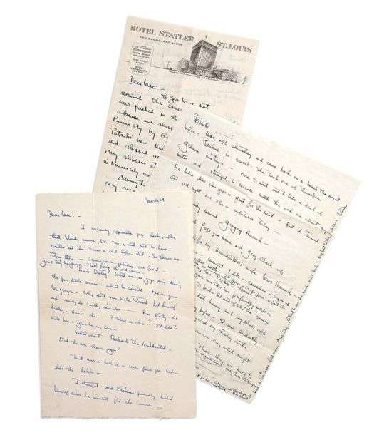 3 L.A.S. « Ernie », « Hemingstein » et « Ernie », 1931-1932, à « Dear Mac », son ami Charles MACGREGOR | 6 pages petit in-fol. ou in-4, la 1ère à en-tête et vignette de l’Hotel Statler, 2 enveloppes | en anglais.