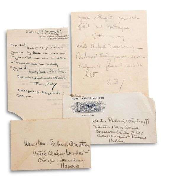 2 L.A.S. (« E. Hemingway » et « Ernest » pour la 1ère, et « Hemingstein » la 2e ), [La Havane s.d.], à Richard ARMSTRONG à La Havane | 2 pages in-8 au crayon à en-tête Steamship Cuba et vignette The Peninsular & Occidental Steamship Company, et 1 page petit in-8 (sur un fragment de bordereau imprimé en espagnol), enveloppes | en anglais.