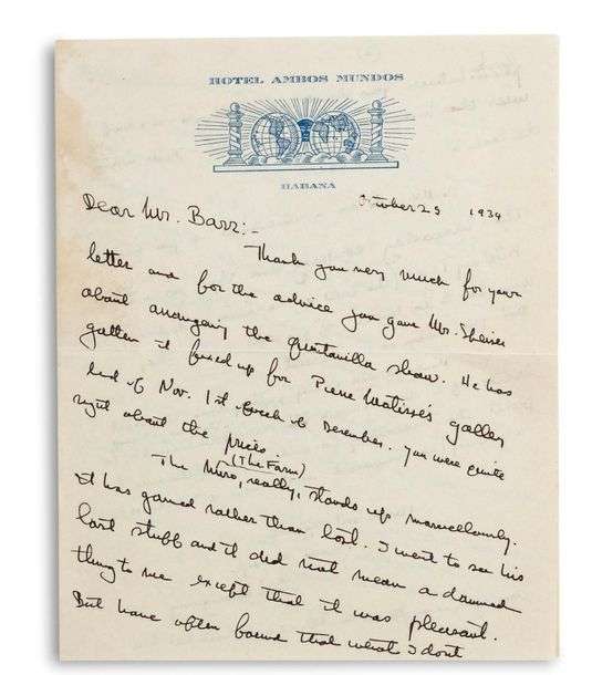 L.A.S. « Ernest Hemingway », La Havane 29 octobre 1934, à Alfred H. BARR Jr., directeur du Museum of Modern Art à New York | 3 pages in-8, en-tête Hotel Ambos Mundos (petites fentes aux plis), enveloppe | en anglais.