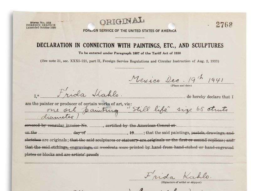 Déclaration d’envoi aux États-Unis d’une de ses œuvres intitulé Still Life, contresignée par le vice-consul des États-Unis au Mexique. Frida Kahlo certifi e qu’elle est l’auteur d’une peinture à l’huile, Still Life, mesurant 65 centimètres de diamètre | qu’il s’agit d’un original | que le prix est 300 dollars | qu’il est transporté par Miss Paulette GODDARD en avion jusqu’à Brownsville (Texas). [Il s’agit ici de son tableau Panier de fl eurs, alors désigné comme « Nature morte », peint par Frida Kahlo en 1941. Frida Kahlo venait de se remarier avec Diego Rivera (après leur divorce en 1938). L’actrice américaine Paulette GODDARD (1910-1990) a rencontré pour la première fois Frida Kahlo en 1941, et fut un temps la maîtresse de Diego Rivera.]