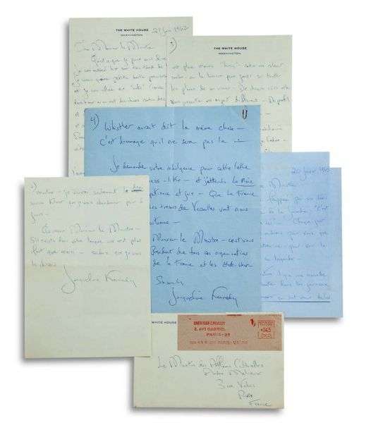 3 L.A.S. « Jacqueline Kennedy », 1962- 1963, à André MALRAUX, ministre des Aff aires culturelles | 6 pages petit in-4 à en-tête The White House, 4 pages petit in-4 à en-tête L’Episcopio Ravello, et 5 pages in-8 à en-tête The White House, une enveloppe | en français.