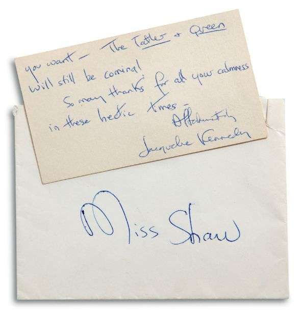 L.A.S. « Jacqueline Kennedy », à Miss SHAW | 2 pages oblong in-12 d’une carte orné d’une lanterne décorée de branches de houx, enveloppe | en anglais.