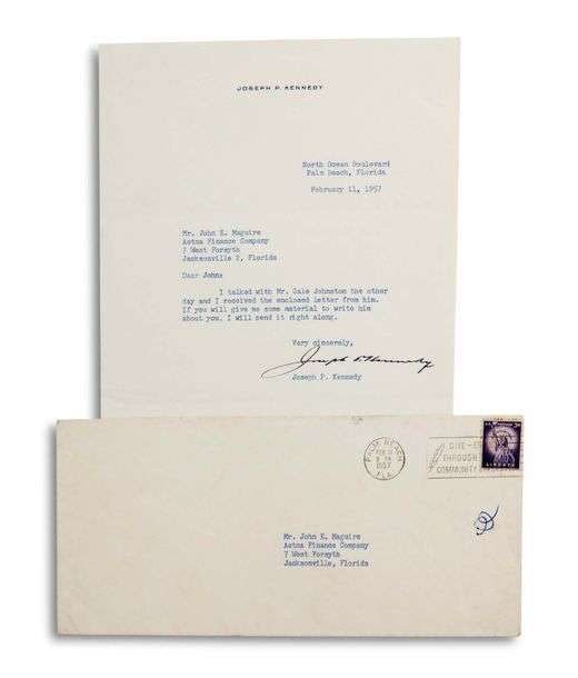L.S. « Joseph P. Kennedy », Palm Beach (Floride) 11 février 1957, à John E. MAGUIRE, à l’Ætna Finance Company, à Jacksonville (Floride) | ¾ page in-4 dactylographiée à son en-tête, enveloppe | en anglais.