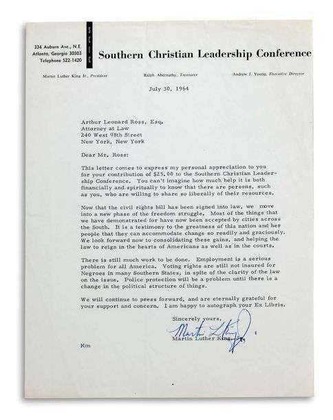 L.S. « Martin L. King », très certainement Atlanta (Georgia) 30 juillet 1964, à Arthur Leonard ROSS | 1 page in-4 dactylographiée, à en-tête Southern Christian Leadership Conference | en anglais.