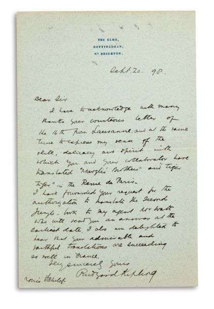 Il est très sensible à l’habileté, à la délicatesse et à l’esprit avec lesquels Fabulet et son collaborateur [Robert d’HUMIÈRES] ont traduit Mowgli’s Brothers et Tiger, Tiger dans la Revue de Paris. Il a transmis sa demande d’autorisation de traduire le Second Junglebook à son agent Watt, qui lui répondra. Il est ravi d’apprendre que ses traductions fidèles et admirables réussissent si bien en France…
