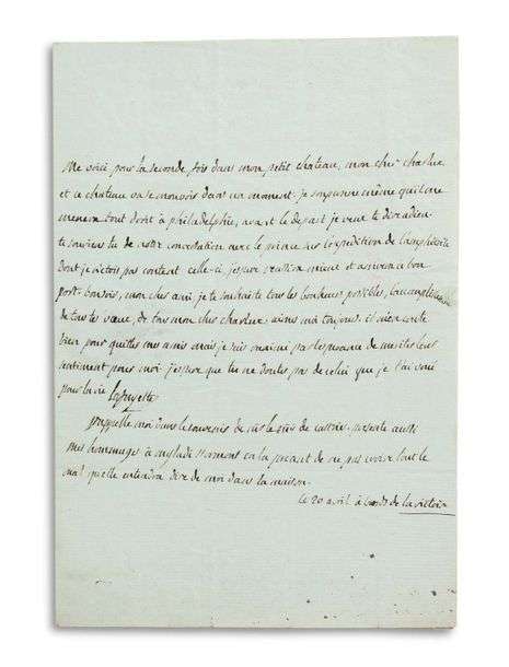 « Me voici pour la seconde fois dans mon petit chateau, mon cher Charlux et ce chateau va se mouvoir dans un moment. Je soupçonne même qu’il me menera tout droit à Philadelphie | avant le départ je veux te dire adieu. Te souviens-tu de notre conversation avec le prince sur l’expedition de l’Amphitrite dont je n’étois pas content celle-ci, j’espere reussira mieux et arrivera à bon port. Bonsoir, mon cher ami, je te souhaite tous les bonheurs possibles, l’accomplissement de tous tes vœux [...] Aime moi toujours. Il m’en coute bien pour quitter mes amis mais je suis ranimé par l’esperance de meriter leur sentiment pour moi »... Il se rappelle au souvenir du marquis de CASTRIES et à celui de Milady HORMONT « en la priant de ne pas croire tout le mal qu’elle entendra dire de moi dans la maison ».