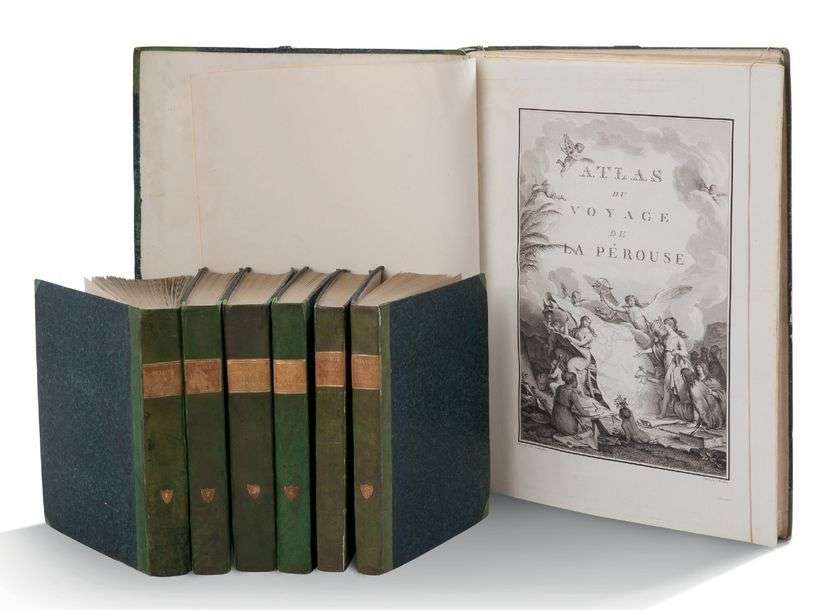 Avec le portrait de La Pérouse gravé par Tardieu en frontispice du premier volume, et accompagné d’un atlas renfermant un titre-frontispice de Moreau gravé par Trière et 69 planches gravées en taille-douce, dont une grande mappemonde dépliante, 20 cartes à double page, 10 cartes à pleine page et 38 planches de vues, relevés côtiers, histoire naturelle, scènes de mœurs, costumes et types indigènes, le tout gravé en tailledouce par Le Pagelet, Thomas, Godefroy, Choffard, Avril, Legrand et d’autres d’après Duché de Vancy, Blondela, Prévost, La Martinière, etc.