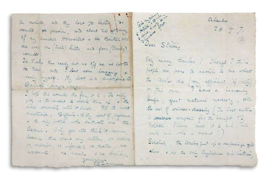L.A.S. « T.E. Lawrence », Akaba 25 septembre 1917, au Major Walter STIRLING | 4 pages in-8 (légères traces de rouille) | en anglais.