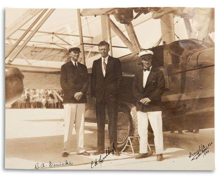 Elle montre Lindbergh debout devant son biplan amphibie Sikorski S-38, entouré de deux hommes, dont son radio Bert A. DENICKE, qui a également signé.