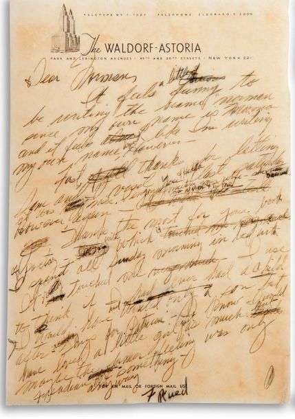 L.A.S. « Marilyn M. », New York [vers 1955 ?], à Norman ROSTEN | 1 page et demie in-4 à en-tête The WaldorfAstoria avec ratures et corrections (légères mouillures) | en anglais.