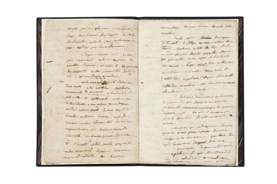 MANUSCRIT autographe, Notes diverses. Richesse des nations…, Valence juillet 1791 | 13 pages in-fol. d’un cahier de 4 bifeuillets (trace de collage dans la marge de la 1ère page) | sous chemise de veau noir et boîte-étui de veau noir.