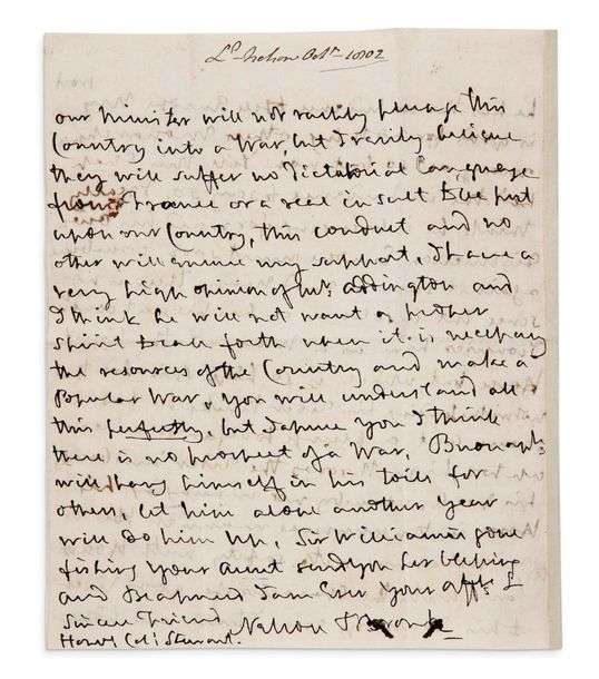 L.A.S. « Nelson & Bronte », Merton 12 octobre 1802, à l’honorable colonel William STEWART | 4 pages in-4, montées avec un portrait gravé sous chemise de toile brune, sous boîte-étui demi-maroquin brun | en anglais.
