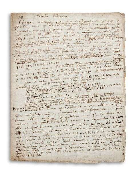 MANUSCRIT autographe, Notanda Chemica, [années 1670] | 8 pages petit in-4 dont seules les 4 premières pages sont écrites (20,4 x 15,4 cm), une feuille entière pliée (filigrane : cor de postillon HG / MC), les 4 dernières pages vierges et non coupées | 33 à 36 lignes par page, avec des additions interlinéaires, des ratures et corrections | en latin avec un paragraphe partiellement en anglais