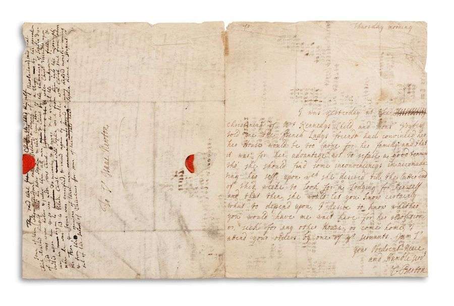 MANUSCRIT autographe | 2 pages et quart in-4, au verso et en partie au recto d’une L.A.S. « C. Barton » de sa nièce Catherine BARTON à lui adressée (1 page in-4) avec adresse, et restes de cachet de cire rouge (quelques petites fentes) | en anglais.