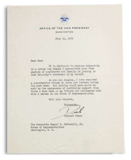 L.S. « Dick », Washington 31 juillet 1956, à Samuel K. McCONNELL Jr | 1 page petit in-4 dactylographiée, vignette et en-tête Offi ce of the Vice President, enveloppe avec sa griff e | en anglais.