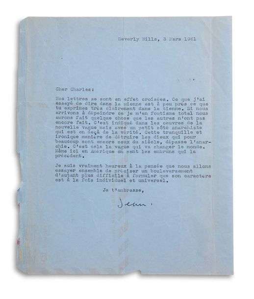 L.S. « Jean », Beverly Hills 3 mars 1961, à Charles SPAAK | 1 page in-4 dactylographiée, sur papier bleu adresse au verso | en français.