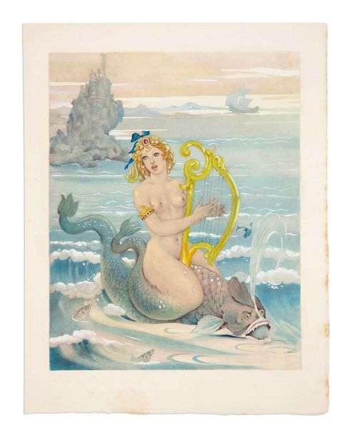 In-4, 119 pp., ouvrage illustré par Umberto Brunelleschi d’un frontispice et de 11 planches hors texte. Tirage à 452 exemplaires. Un des 30 exemplaires sur Rives blanc à la forme (celui-ci no. 14), comprenant une AQUARELLE ORIGINALE inédite, une suite en noir et une suite en bistre sur Arches blanc | coloriage des gravures entièrement exécuté au pochoir par Jean et Paulette Monnier. En feuilles, couverture imprimée rempliée, chemise et étui assortis de l’éditeur (chemise et étui frottés | quelques petites rousseurs sans atteinte aux planches). Dimensions : 330 x 255 mm.