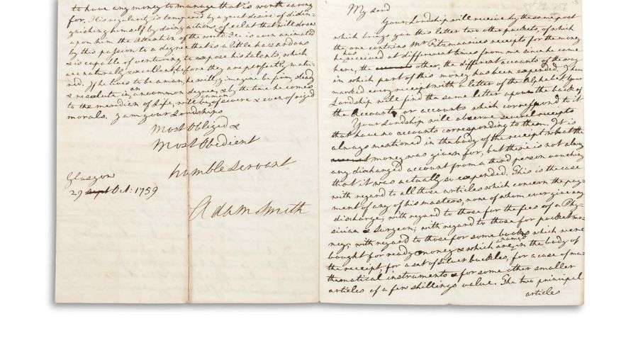 L.A.S. « Adam Smith », Glasgow 29 octobre 1759, à « My Lord » [John Petty, Earl of SHELBURNE] | 4 pages in-4 (pli un peu jauni au dernier feuillet) | en anglais.