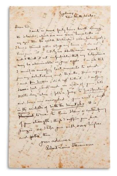 L.A.S. « Robert Louis Stevenson » et « R.L.S. », Sydney (New South Wales) [février 1891 ou mars 1893 (?)], à Francis Marion CRAWFORD | 2 pages in-8 (rousseurs) | en anglais.
