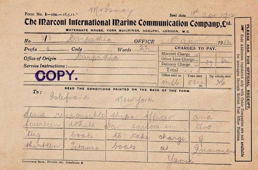 En tant que directeur de la compagnie maritime à laquelle appartenait le bateau, Bruce Ismay a voulu faire la traversée inaugurale du Titanic. Le premier bateau à répondre aux appels de détresse fut le Carpathia, qui était alors à 58 miles et quatre bonnes heures de distance du naufrage. Arrivé une heure et vingt minutes après que le Titanic eut coulé, le Carpathia prit à son bord les survivants qui furent assez chanceux pour monter dans un canot de sauvetage. Une fois à bord du bateau, Ismay prévient son bureau de New York à 5h50 du matin le 15 avril 1912 que le Titanic a coulé ce matin 15 après une collision avec un iceberg, causant de sérieuses pertes hu
